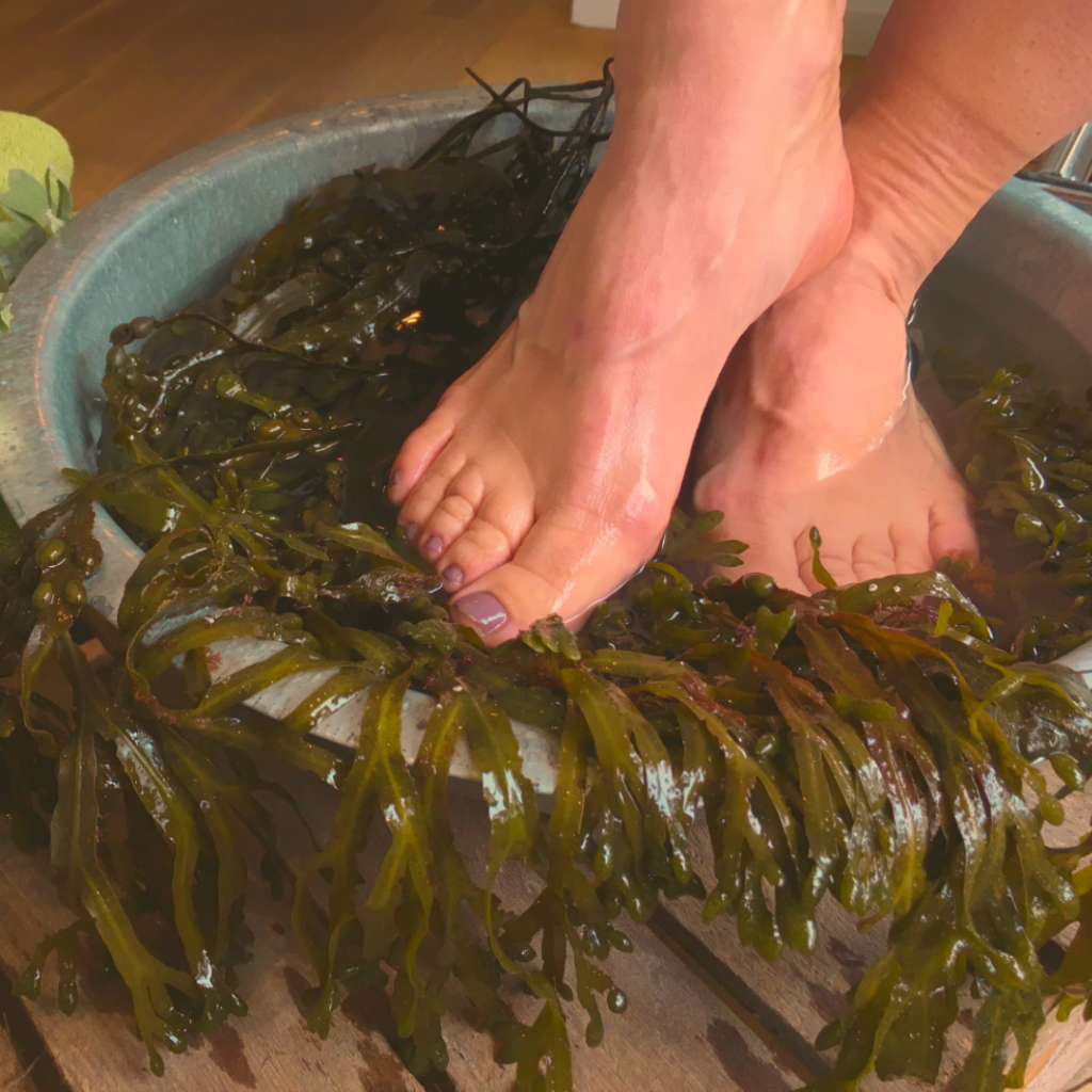 Behandlingen fortsätter med en scrub med tång från halländska västkusten, oljan från tången är närande och mjukgörande för huden.