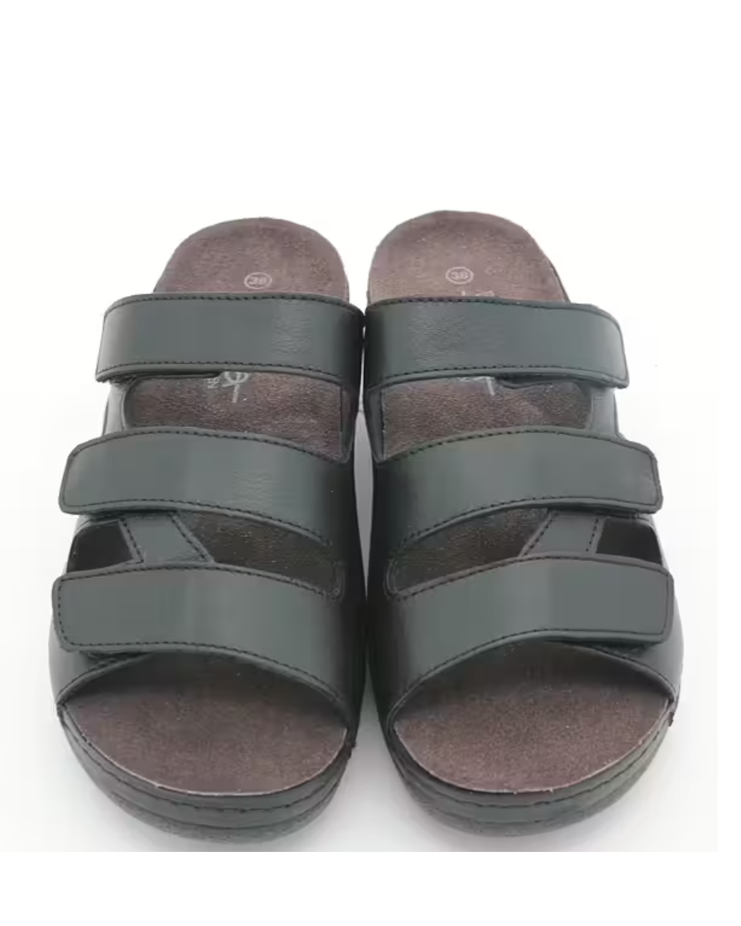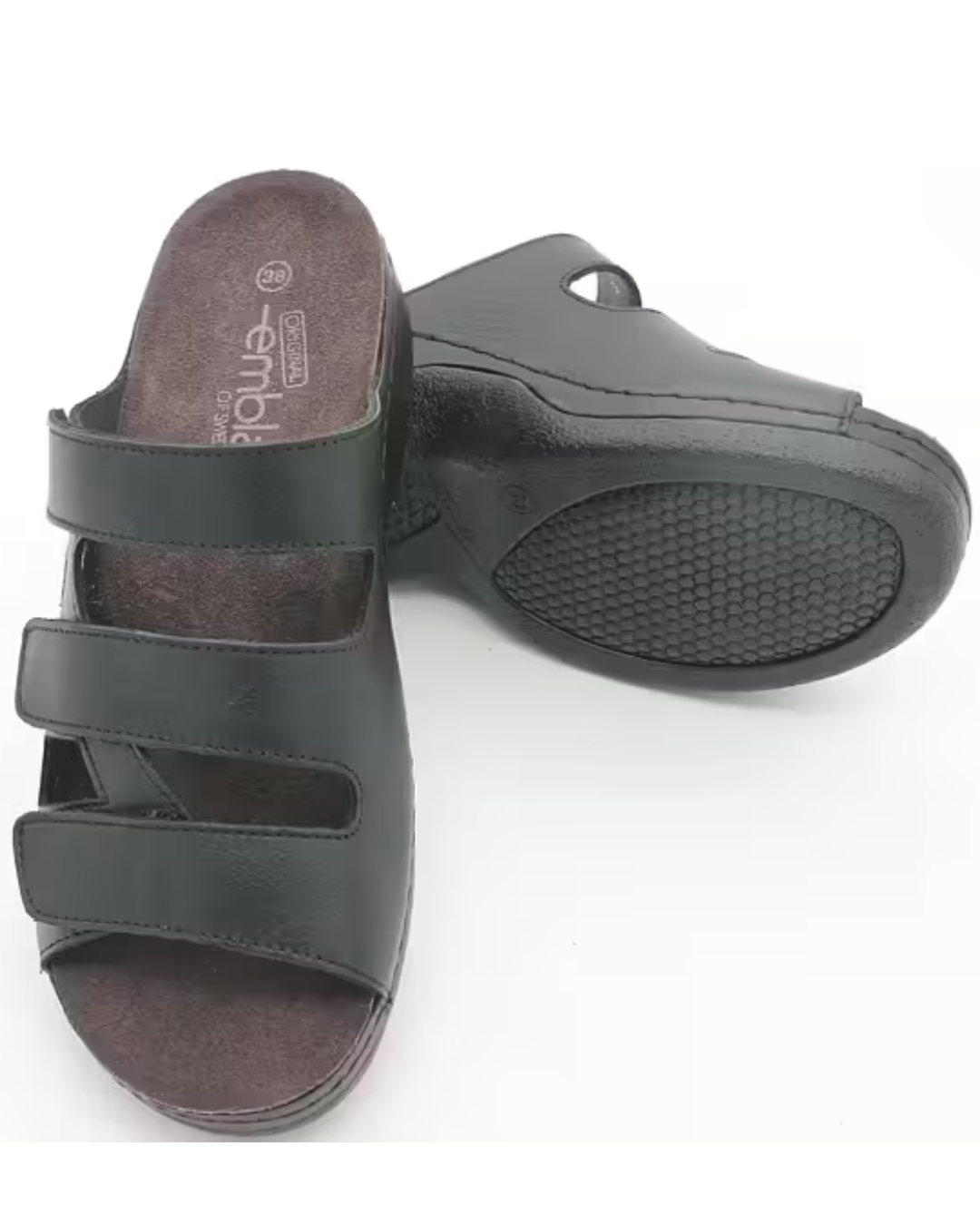 Fotriktiga sandaler för dig som lätt blir trött i fötterna. Mjukt svart skinn och skinnfodrad. Remmarna över foten är justerbara med kardborre.