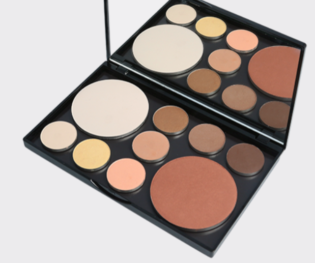 I förpackningen kan du placera våra Eyeshadow, Blush, Highlighter, Bronzer, Compact Powder och Compact Cover enligt önskad färgskala.