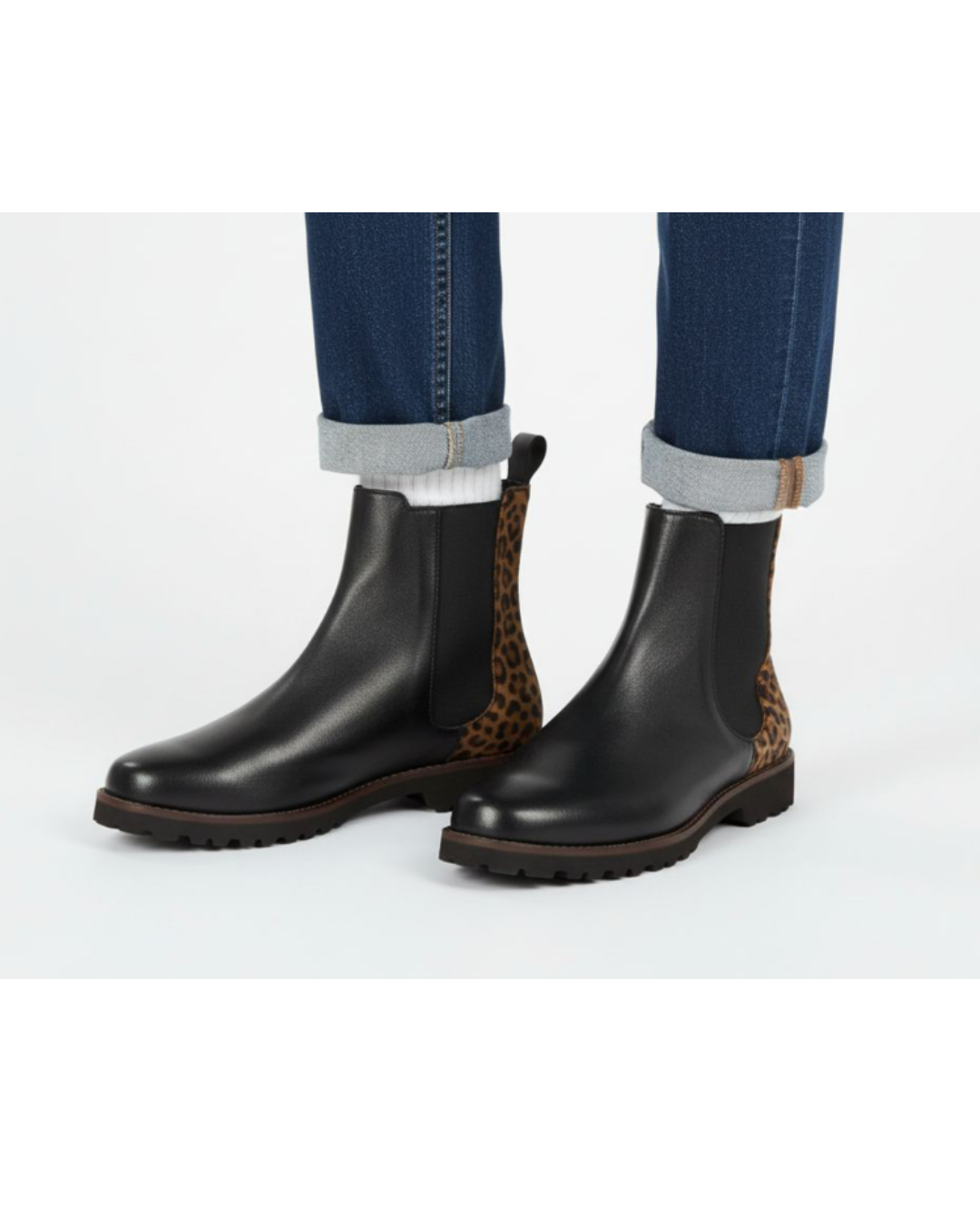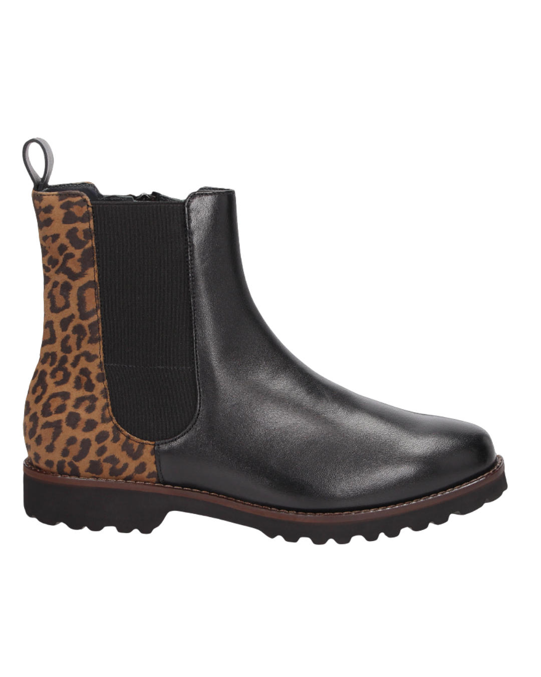 Smäcker boot i svart läder med en exklusiv leo-infällning i bakkappan. Resår på sidan samt dragkedja på insidan för ett lätt insteg. Uttagbar innersula.
